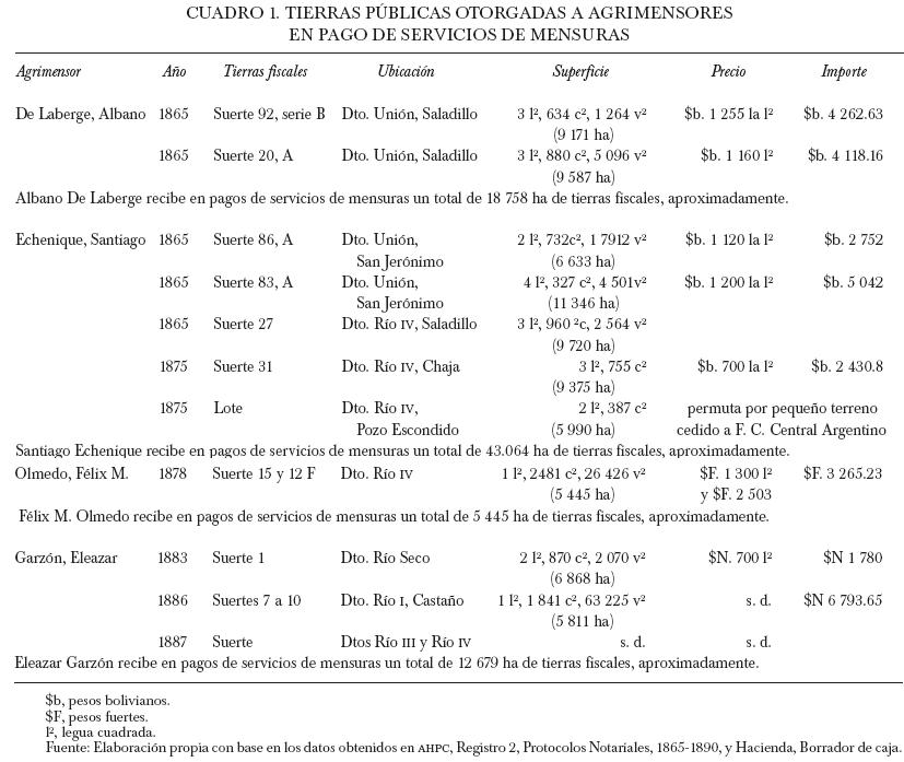 También en 1869 el estado provincial firmó otro contrato para mensurar, amojonar, hacer un registro de escrituras de las propiedades y hacer los planos de los departamentos de Río Primero y de San Justo, en el este provincial. El agrimensor contratado fue Eleazar Garzón, perteneciente a una familia muy vinculada al poder político provincial; otro miembro alternativo de su familia, Tomás Garzón, llegó a ser ministro de Hacienda en el periodo siguiente, correspondiente al gobierno de Juan Antonio Álvarez y el propio Eleazar fue vicegobernador desde mayo 1889 hasta julio de 1890 en el que, por renuncia del titular, Marcos Juárez, se hizo cargo del ejecutivo provincial hasta finalizar el periodo en 1892.46 Las condiciones de pago por los trabajos contratados fueron similares a los contratos que ya hemos visto: 40 pesos bolivianos por cada legua cuadrada que midiese y amojonase. El trabajo de Garzón fue lento y recién concluyó de mensurar el departamento San Justo en 1899. En el cuadro 1 mostramos algunas de las adjudicaciones de tierras públicas efectuadas a los agrimensores como pago por sus servicios de mensuras y planos topográficos.