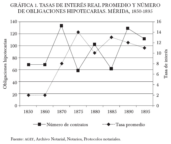 En su papel de intermediario entre el prestador y el prestamista el notario público yucateco se convirtió en una pieza central en la economía yucateca. En ausencia de las instituciones bancarias, el notario era la única institución legal que proporcionaba validez legal para hacer cumplir estos contratos financieros. Como se puede ver en la gráfica 1, antes de 1861 las obligaciones hipotecarias protocolizadas por notarios se apegaban a los límites legales. Antes de 1861 el límite legal de las tasa de interés era de 6% anual para préstamos comerciales y 5% para los no comerciales. Como vemos en la gráfica, la mayoría de los préstamos que generaban intereses se apegaban al límite legal en los periodos de 1850 y 1860. El nivel de la tasa de interés media está muy por debajo del 5 y 6% porque la mayoría de los contratos no llevaban tasa de interés. En cuanto entró en vigencia el decreto de 1861 y se liberalizó el precio del crédito, las tasas de interés incrementaron mucho por arriba de los límites eclesiásticos.