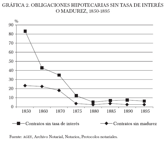 Otra manera de interpretar los cambios es verlos como parte de la transformación moderna de los mercados de crédito. La gráfica 2 demuestra cómo a largo plazo el decreto de 1861 y la Ley Orgánica del Notariado de 1865 cambiaron y modernizaron los parámetros de las obligaciones hipotecarias.