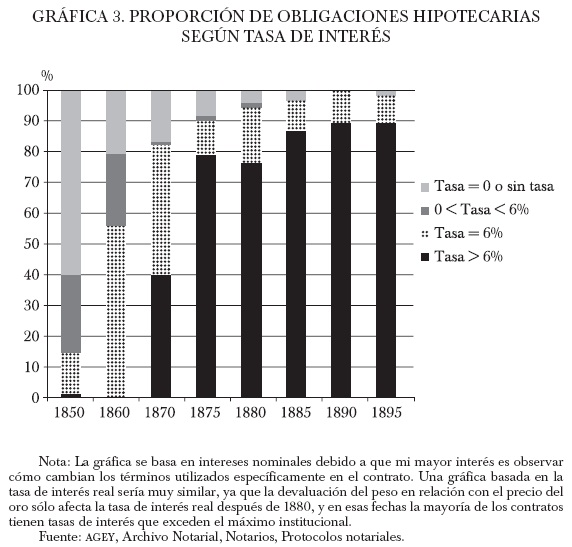 La gráfica 3 separa los datos de obligaciones hipotecarias en cuatro categorías: la primera está compuesta de contratos que no llevaban tasa de interés; la segunda incluye las hipotecas con tasas de interés entre arriba de cero y debajo de 6% anual (que era el límite eclesiástico), y la tercera incluye las hipotecas con tasas de interés de 6% anual exacto. Finalmente, la cuarta se compone de hipotecas con tasas de interés mayor a 6% anual (lo cual hubiera sido ilícito antes de 1861). Cada patrón dentro de cada barra representa el porcentaje de esa categoría en particular.