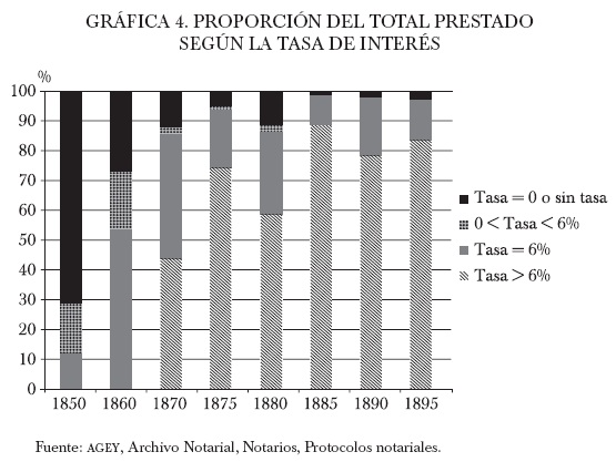En los años 1850 y 1860 no se ve ningún contrato con tasa de interés excedente a 6%, lo que confirma que se respetaban oficialmente las leyes usurarias. En 1850, 60% de las hipotecas en Yucatán no llevaban tasa de interés. En 1860 muchos más contratos registran tasa de interés, pero oficialmente el crédito hipotecario sigue siendo barato, con 80% de los contratos con tasa de interés, pero pocos exceden el 6% anual. Esto cambió precipitadamente después de 1870. En este año la tasa de interés promedio aumentó gradualmente por arriba de 6% anual, y las tasas posteriores a 1875 nunca cayeron debajo de 10% anual. Las hipotecas protocolizadas después de 1870 que no llevaban tasa de interés se volvieron rarísimas, ya que nunca excedieron el 5% del total de los contratos. El decreto de Benito Juárez eliminó la necesidad de restringir las tasas para escribir contratos hipotecarios que cumplían tanto con los requisitos legales como con la necesidad del prestamista de verse compensado adecuadamente. La grafica 3 también revela que, a lo largo del siglo XIX, las tasas de interés no sólo se volvieron un parámetro fijo en los contratos de deuda, sino, además, un parámetro que nunca volvió a caer debajo de los límites impuestos por la Iglesia cuando esta aún tenía voz en estos asuntos.