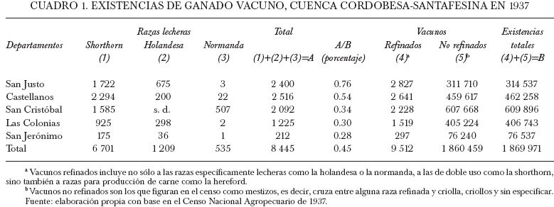El cuadro 1 muestra las existencias ganaderas en los departamentos de Córdoba y Santa Fe que conformaban la cuenca lechera cordobesa-santa-fesina en 1937. Las razas lecheras que se habían introducido -holandesa y normanda- eran muy pocas en relación con el rodeo vacuno total. La raza vacuna shorthorn, que tiene la particularidad de ser empleada para doble uso (carne y leche) en mayor medida que la holandesa o normanda, estaba más difundida que las más específicamente lácteas. La proporción de vacunos de doble uso y específicamente lecheros en relación con el total ganadero, al que denominamos índice de refinamiento lechero, no llegaba ni siquiera a 1% (0.45%). Esto significa que los tambos de la cuenca no habían invertido en refinar sus rodeos vacunos.