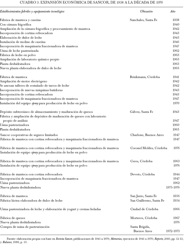 Como se puede observar en el cuadro 3, la instalación de las fábricas de manteca se inició durante la década de 1940, continuó en la siguiente y se extendió incluso a la de 1960. Para la planificación técnica general se instituyó desde 1944 una jefatura general de elaboración de manteca. Con la instalación de cada fábrica de manteca se iba incrementando la capacidad productiva y se incorporaban nuevas maquinarias como batidoras, fraccionadoras, refrescadoras, etc. Por ejemplo, la fábrica de Brinkmann, comprada a Spirandelli Cía. en 1941, tenía una capacidad de producción de 3 500 kg de manteca diarios y pasó a 10 000 kg en sólo dos años debido a la ampliación en la disponibilidad de energía. La fábrica de Devoto fue creada para abastecer el crecimiento de Sancor hacia el sudoeste de la cuenca. Los quesos eran elaborados en las cooperativas de la Tordilla, Villa Vaudagna, Campo Mendoza, Zona de Gálvez, El Fortín y Morteros y almacenados en un depósito subterráneo construido por Sancor. Desde 1947 la empresa erigía una fábrica de quesos con laboratorio propio de análisis. En la segunda mitad de la década de 1940 la jefatura general incorporó las máquinas fraccionadoras de manteca y las cortinas refrescadoras al conjunto de las fábricas.