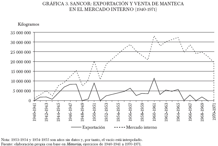 La producción de manteca y caseína creció de manera relevante durante el periodo considerado. Se colocaban en el mercado interno y externo. No obstante, en el caso de la caseína la importancia relativa del mercado externo fue siempre mayor. La venta de manteca se incrementó de 1 016 651 kg en el balance 1940-1941 a 17 050 985 kg en el balance 19701971; en la segunda mitad de la década de 1950 y en el primer quinquenio de la década de 1960 las ventas oscilaban entre 30 000 000 y 23 000 000 de kilogramos anuales. A mediados de la década de 1960 la producción de manteca alcanzó un techo y luego comenzó a disminuir.