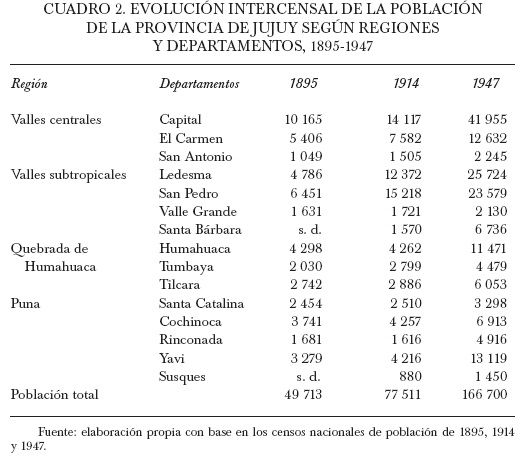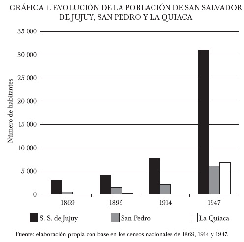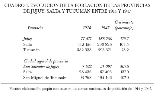 Durante este periodo fue notoria la evolución demográfica de Jujuy producto, en buena medida, del crecimiento natural de sus habitantes, así como del arribo de una mayor inmigración, tanto extranjera como proveniente de otras provincias. Actividades como la minería, el comercio y principalmente la producción azucarera llevaron a la concentración demográfica en localidades que se constituyeron en polos de atracción.3 A principios de la centuria, pese a que Jujuy presentaba una población eminentemente rural, constituía una de las provincias del Noroeste con un importante ritmo de desarrollo urbano.4