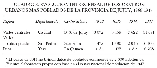 Estos datos reflejan el constante e intenso crecimiento de las principales ciudades en Jujuy durante este periodo. Ciertamente, esto puede patentarse al comparar su evolución demográfica a lo largo de los primeros censos nacionales. En este proceso resalta, hacia 1947, el notorio incremento de tres urbes, ubicadas en la región de los valles centrales, subtropicales y la Puna: San Salvador de Jujuy, San Pedro y La Quiaca, respectivamente. Estas ciudades, precisamente, se encontraban ubicadas en tres de aquellos departamentos más poblados de la provincia (véase cuadro 3).