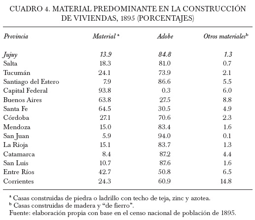 Según el censo de 1895, y de acuerdo con el pensamiento liberal y positivista de la época, el país mostraba alentadores índices en las construcciones "de material", es decir, basadas en la utilización de ladrillo o piedra en lugar de adobe.16 No obstante, este fenómeno favoreció sobre todo a las provincias del Litoral, evidenciándose mucho menos en otras regiones, como el Noroeste. Así, en el caso de Jujuy, 84.8% de las viviendas era de adobe. Estos datos se hallaban en consonancia con los que mostraba el resto de la región, pero el porcentaje en Jujuy (84.8%) superaba al de las provincias de Salta (81%) y Tucumán (73.9%), aunque se hallaba aún por debajo de los que exhibían Santiago del Estero (86.6%) y Catamarca (87.2%). Estos altos índices eran comparables con los que exhibía la región cuyana,17 con una alta proporción de construcciones de adobe y, naturalmente, un retraso en el conjunto de viviendas de material (véase cuadro 4).