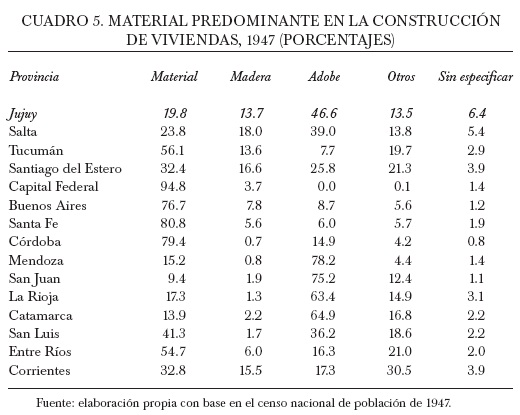 Ciertamente, en 1947 la provincia mostraba uno de los índices más altos del país en viviendas con piso de tierra, en consonancia con las tendencias que mostraban el Noroeste y Cuyo. En aquel año, 67% de las casas jujeñas tenía piso de tierra, 13% de baldosas y mosaicos, 6% de madera y 14% de otros materiales. De acuerdo con estos datos, es dable suponer la precariedad de gran parte de las viviendas de Jujuy, incluso pese a que sus techos eran de zinc. En efecto, este material estaba presente en más de la mitad de las casas de la provincia (58%). Esta proporción era la más alta de la región y una de las mayores del país, superada lógicamente por las provincias del Litoral, mientras en las provincias cuyanas predominaban los techos construidos de otros materiales (probablemente el "torteado").27