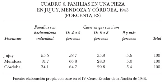 A diferencia del hacinamiento colectivo, el hacinamiento individual era más recurrente e importante en la provincia y afectaba a 55.5% de las familias censadas. Debe tenerse en cuenta que la mayoría de estos casos traducía de hecho situaciones en que el núcleo familiar no solamente dormía, sino que también cocinaba, comía y hasta trabajaba en la misma habitación.31 Estos índices eran comunes en el Noroeste –en Santiago del Estero el fenómeno se presentaba en 61% de los hogares– y elevados en relación con provincias de otras regiones como Mendoza o Córdoba. Cabe destacar que en la época el hacinamiento individual era calculado considerando cuatro personas por habitación. Esta relación en los hogares urbanos en pocas ocasiones coincidía con la media de los miembros de una familia, conformada en general con más integrantes, y mucho menos en los hogares rurales que contaban con amplios grupos familiares, como en la Puna por ejemplo (véase cuadro 6).32