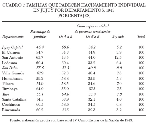 En Jujuy, el hacinamiento colectivo, aunque frecuente en la zona rural, no presentaba los porcentajes más elevados en el ámbito nacional. Para 1943, 36.8% de las familias jujeñas censadas compartía la vivienda con otras, de las cuales 71.8% estaba constituido por grupos de entre cuatro y seis familias y 23.8% de entre siete y diez familias por casa. En el plano regional estos porcentajes eran relativamente similares a los que exhibía el resto de las provincias del Noroeste.