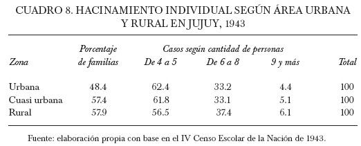 Al igual que con el hacinamiento colectivo, en Jujuy los mayores casos de hacinamiento individual se producían en la zona rural, aunque los índices también eran significativos en la zona urbana, llegando casi a 50% del total registrado. En la mayoría de las ciudades, cerca de la mitad de las familias censadas padecía de hacinamiento individual. Estos datos revelan que, si bien eran notorias las diferentes condiciones de vida en general de la población rural y urbana, las deficiencias habitacionales en la ciudad eran aún muy similares a las que padecían varias familias campesinas en la provincia (véase cuadro 8).
