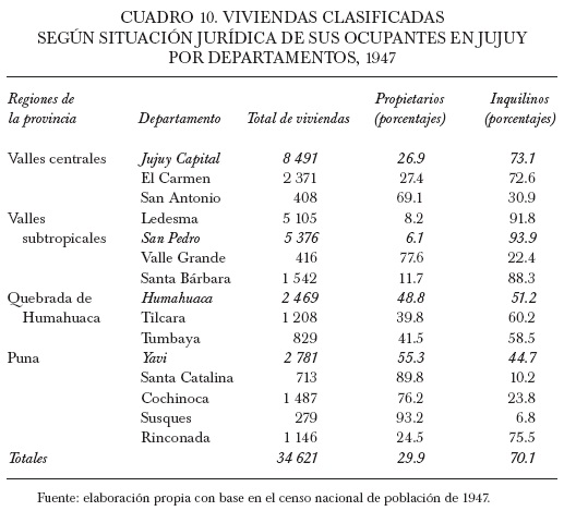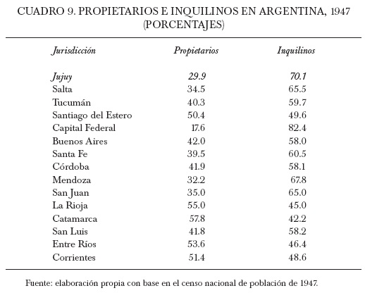 El censo de 1947 registró que en Jujuy sólo 30% de las casas estaban ocupadas por sus dueños. Estos datos ubicaban a este distrito entre aquellos con mayor proporción de inquilinos no sólo de la región, sino del país, superado únicamente por la capital federal con un porcentaje de 18% de propietarios. Estas tendencias reflejaban, una vez más, lo difícil que era la obtención de la casa propia en Argentina y, dentro de este marco, el nivel de gravedad que asumía esta cuestión en Jujuy (véase cuadro 9).
