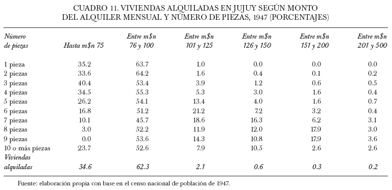 En definitiva, y reforzando el supuesto citado en el apartado anterior, en la ciudad capital es muy probable que no sólo los conventillos albergaran núcleos familiares, sino también varias casas particulares. Muchos de estos cuartos eran alquilados con el objetivo de contribuir con esta renta a distintos fines, tales como equilibrar el presupuesto familiar, ampliar, mejorar o terminar completamente la propia vivienda. Precisamente el cuadro 11 da cuenta de los múltiples casos en que las familias compartían la vivienda, más allá de que por lo común contara con pocas habitaciones.