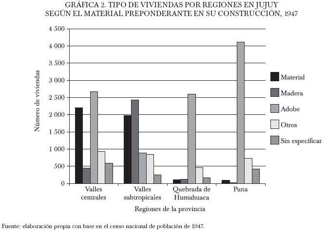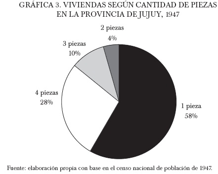 En síntesis, en Jujuy la mayor parte de las viviendas edificadas principalmente de adobe, material y madera presentaban pisos de tierra y techos de zinc. Estas características, se concentraban sobre todo en las casas que poseían entre una y cuatro habitaciones. De hecho, la existencia de unidades con pocas piezas fue, hacia 1947, uno de los rasgos característicos de la provincia y nuevamente frecuente en gran parte de sus homónimas del Noroeste (véase gráfica 3).28