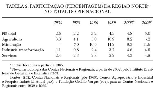 Um balanço muito geral do período 1939-1970 mostra, para a região Norte, os seguintes resultados: pequena recuperação em sua participação no produto interno bruto (PIB) nacional em relação aos baixos níveis vigentes entre 1949 e 1960; aumento em sua participação no PIB agrícola nacional graças à sua integração com o mercado nacional; pequena perda de participação no PIB nacional do setor serviços, certamente devida à sua precária urbanização; embora a estrutura produtiva de sua indústria de transformação pouco mudou, sofreu pequena perda de participação no PIB nacional do setor, devido a que entre 1939 e 1949 a região também se beneficiou do efeito da industrialização nacional, tendo sido sua taxa média anual de crescimento do setor de 4%, mas inferior às do Brasil (7.8%) e de São Paulo (9.8%); mas a partir do momento em que sua integração com o mercado nacional cresce, sua taxa se acelera (entre 1949 e 1970) para 8.8%, muito próxima às do Brasil (8.3%) e de São Paulo (9.2%), mostrando, no fim do período (1967-1970), os primeiros efeitos positivos da Zona Franca de Manaus (ver tabela 2).