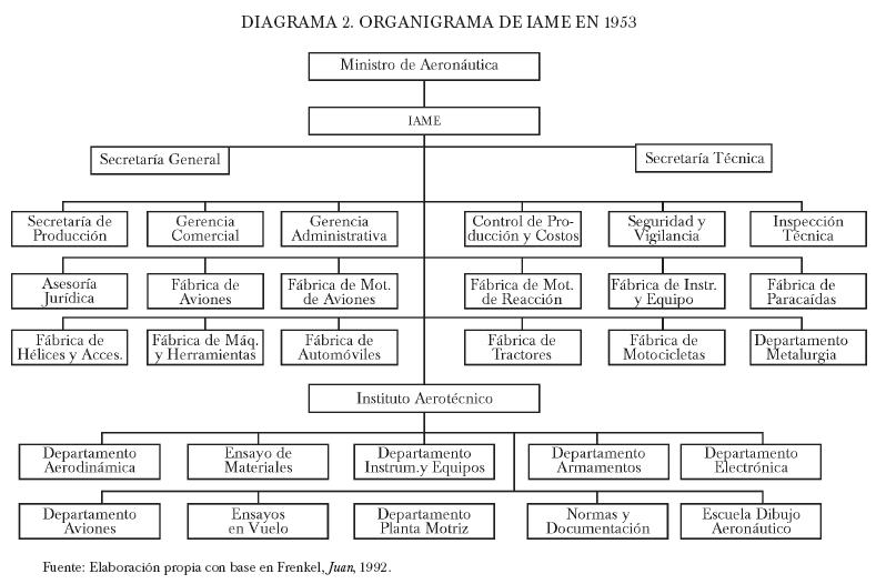 El 28 de marzo de 1952, sobre la base de los bienes y personal hasta entonces afectados al Instituto Aerotécnico, se crea por decreto número 6191, Industrias Aeronáuticas y Mecánicas del Estado (véase diagrama 1). Constituida como una empresa autárquica sometida al régimen de la ley número 13653 de Empresas del Estado,47 IAME tenía a su cargo:
