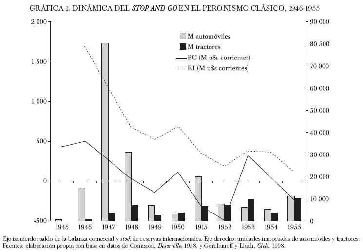 Con la crisis de divisas de finales de los años cuarenta, el peronismo pasó a enfrentar la primera depresión de la economía argentina de naturaleza cíclica stop and go.39 En 1949, con la reversión de los términos de intercambio (-11%), la economía peronista tuvo su primer año de contracción. En los siguientes dos se retomó el crecimiento, aunque a tasas bastante menores a las de los primeros años dorados. Para 1951 la economía argentina discurría por una nueva fase ascendente del ciclo, manifiesta por un crecimiento de las importaciones muy por encima de aquel exhibido por las ventas externas (63% contra menos de 20%), resultando en la conversión del superávit de 122 000 000 de dólares de 1950 en un déficit de 311 para 1951. En 1952, al combinarse condiciones climáticas y términos de intercambio más graves que en 1949, la situación económica se volvió sombría. Pese al establecimiento de restricciones sobre las importaciones, el déficit comercial de 1952 se terminó incrementando 60% (véase gráfica 1).