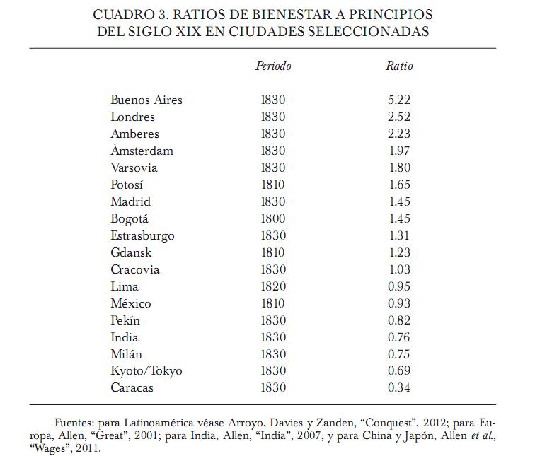 Para evaluar estándares de vida, es necesario obtener datos sobre precios al consumidor, salarios y canasta de consumo. Si bien su recopilación es un desafío, es notable la ausencia de series de salarios para la mayoría de los países latinoamericanos durante la época colonial. Sin embargo, para el siglo XIX la situación es incluso más dificultosa. La disponibilidad de salarios es escasa para todos los países de Latinoamérica, con excepción de ciertos centros urbanos en México, Perú y Bolivia.4 La más reciente contribución para la época colonial es la de Arroyo, Davies y Van Zanden, quienes estiman series de bienestar económico para centros urbanos en Argentina, Bolivia, Colombia, Chile, México y Perú para periodos seleccionados.