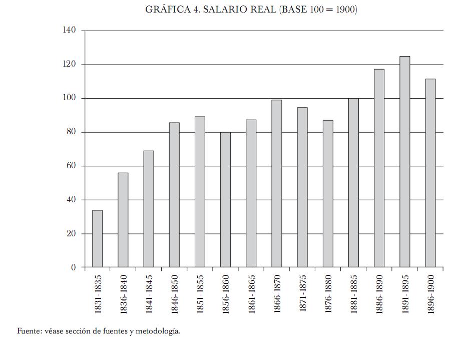 Las últimas dos décadas del siglo XIX muestran un aumento significativo de los salarios reales con una reversión hacia fines de siglo. Hasta 1888, la tendencia, en promedio, fue favorable; el aumento fue de 60% cuando se calcula desde el punto mínimo en 1882 al pico en 1890. El resto del siglo muestra oscilaciones considerables año con año, un comportamiento esperable dada la situación política reinante.