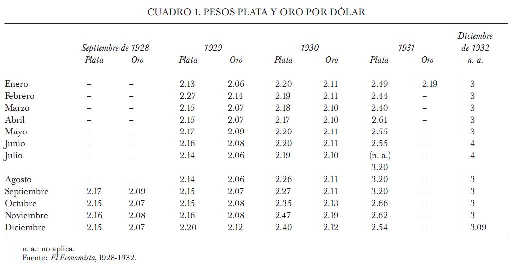 En relación con la depreciación argentífera es necesario atender un punto que contraria muchas apariencias, la relativa constancia del valor de la moneda plata pese a su declive metálico. Incluso la coyuntura parece más caracterizable como un proceso de apreciación áurea que de depreciación del peso plata. Ciertamente, sólo es un matiz pero contribuye a aclarar no justificar por qué se favoreció la política de estabilidad monetaria. La relativa constancia se apreciaba en los números generales de intercambio contra el dólar y el oro. A semanas de operar la Ley de julio, la plata mostró altibajos en la primera y segunda semanas de septiembre osciló de 34.5 a 40.45 centavos de dólar por peso, en Nueva York que llevaron a la Junta Central Bancaria a recomendar un punto de equilibrio relativamente bajo para el peso: tres por dólar (33 centavos de dólar).17 Sin embargo, dos eventos externos modificaron el escenario de la plata, el 20 de septiembre de 1931 Inglaterra suprimió el patrón oro. La decisión se adoptó por la imposibilidad de descontar la libra en oro ante su enrarecimiento debido a las remesas enviadas a Estados Unidos en pago de deudas y a recientes fugas hacia Francia. La decisión inglesa respaldó la intención del 4º Congreso Comercial Panamericano de promover la rehabilitación de la plata para alentar su mayor uso monetario. Estos eventos fueron cambios favorables al mercado de la plata, que comenzó a mostrar un comportamiento que semejaba un bien Giffen (subió de precio pero su demanda aumentó),18 llevando al peso a un punto de equilibrio más alto, como se aprecia al final de 1931. Así, la "ortodoxa" reforma monetaria alcanzó su punto de mayor aprobación gracias a "externalidades". Pero las bondades de la revaluación del peso no eran claras, prevaleciendo un grave estancamiento y una rígida estructura de importaciones. Dados el desequilibrio presupuestal y la balanza deficitaria tampoco era predecible que la paridad se estabilizara en un punto alto. El cuadro 1 nos da una idea de la relativa constancia del valor de la plata.
