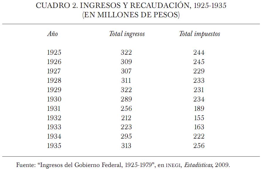 La historiografía suele omitir que la multicitada crisis se enfrentó con un Estado pequeño, ineficiente e institucionalmente dividido que vivía su peor caída de ingresos. Dado su estrecho marco de acción, la Secretaría de Hacienda dedicó buen tiempo a revisar las experiencias de otros países antes de diseñar su política económica. Cuidó limitar el número de impuestos adicionales a un par, una contribución extraordinaria de 1%36 y otra dirigida a los pensionados gubernamentales. Para estimular el gasto, descargó del impuesto sobre la renta a contribuyentes que ganaran menos de 10 000 pesos (que era un ingreso alto). No obstante que el país no pudo restablecer su crédito internacional, se logró contratar un préstamo de 15 000 000 de dólares con el National City Bank de Nueva York37 y negoció anticipos fiscales de compañías petroleras por 10 000 000 de dólares. Para no recortar más empleos, el gobierno redujo salarios entre 10 y 15%. Con esta estrategia intentó compensar una caída de ingresos (en 1931) cercana a 75 000 000 de pesos o 30% del presupuesto de 1929-1930.38 Esta brutal caída era causada por la depresión internacional. Aunque puedan cuestionarse por bajos, los números oficiales ofrecen un panorama de la caída y de la recuperación que, como puede deducirse, no fue milagrosa ni ocurrió en 1933. Incluso en 1934 la recaudación no igualó la de 1930 pese a la devaluación acumulada (véase cuadro 2).