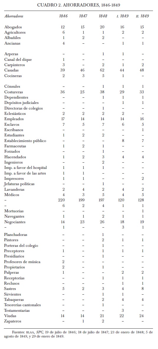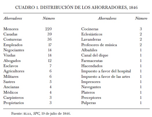 El estudio de la Caja de Ahorros nos ha permitido examinar las diferentes actividades laborales desempeñadas por hombres y mujeres para su subsistencia, y su posible capacidad de ahorro. Al igual que lo que sucedía en otras partes de Latinoamérica, los mayores ahorradores eran los menores y las mujeres. En el caso de los hombres sobresalen los comerciantes, los abogados y los empleados públicos. Artesanos y militares tuvieron poca participación, pese a ser sectores clave en la estructura socioeconómica de Cartagena desde la segunda mitad del siglo XVIII. Para la gente común y corriente, cuyo nivel de vida dependía de un jornal o de ganancias ocasionales por oficios artesanales, las posibilidades de ahorro estaban supeditadas a los salarios. En consecuencia, esas posibilidades se restringieron debido a que durante la primera mitad de ese siglo los salarios y los jornales se mantuvieron estancados y muchas veces decrecieron.