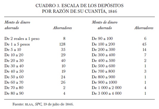 En este informe de 1846, la junta de administradores señala que la escala de los depósitos por razón de su cuantía es la que aparece en el cuadro 3. De los 410 ahorradores, 128 sólo ahorraron en seis meses entre uno y cinco pesos. Además, 325 ni siquiera obtuvieron un peso de ganancia en el semestre, dado que sólo a los que ahorraron 100 pesos o más se les entregó la suma de un peso y 70 céntimos de ganancias mensualmente. Es decir, era muy poco lo que recibía de provecho la mayor parte de los ahorradores de la Caja, por ser tan bajos sus ahorros. Esto es, sin duda, un hecho indicativo de la crisis económica por la que atravesaba Cartagena durante la primera mitad del siglo XIX (véase cuadro 3).