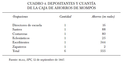 Desafortunadamente, la información suministrada por la Junta de Administradores de la Caja no especifica la capacidad de ahorro de los diferentes sectores socioeconómicos. En este informe no aparece, por ejemplo, cuánto podía ahorrar semanalmente un comerciante, un abogado, un hacendado, un artesano, una pulpera o una planchadora. Sólo contamos con datos parciales, como los suministrados por la Caja de Ahorro de Mompós en 1847, que comunicaba a la Junta de Inversión que los depósitos que se realizaron el 5 de septiembre ascendieron a 555 reales (véase cuadro 4).