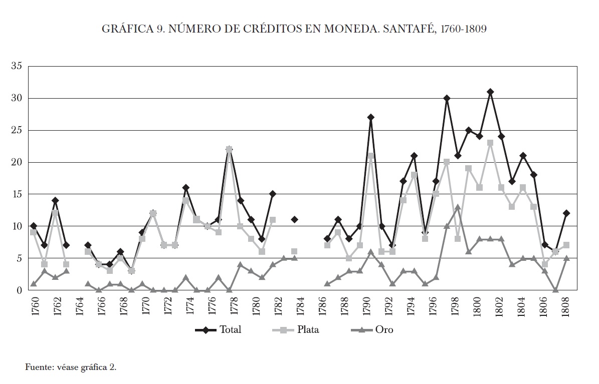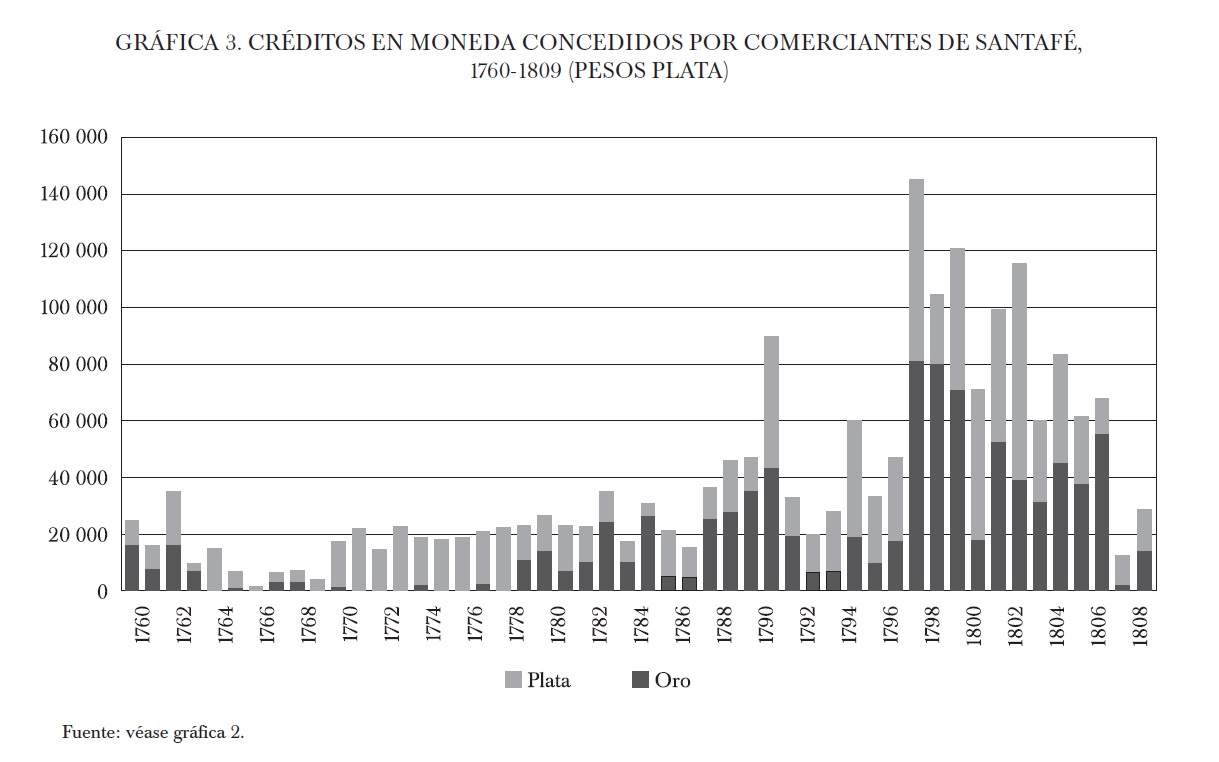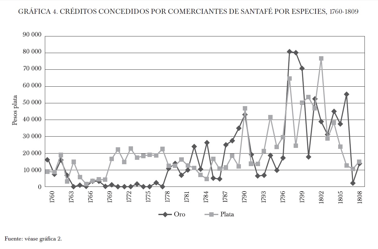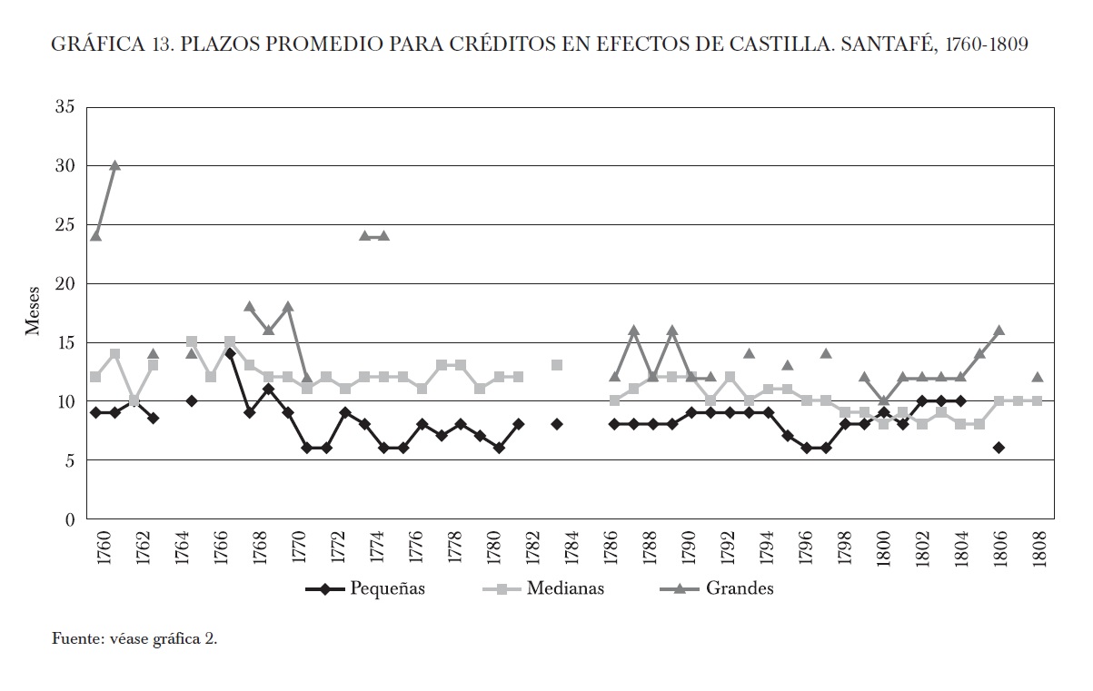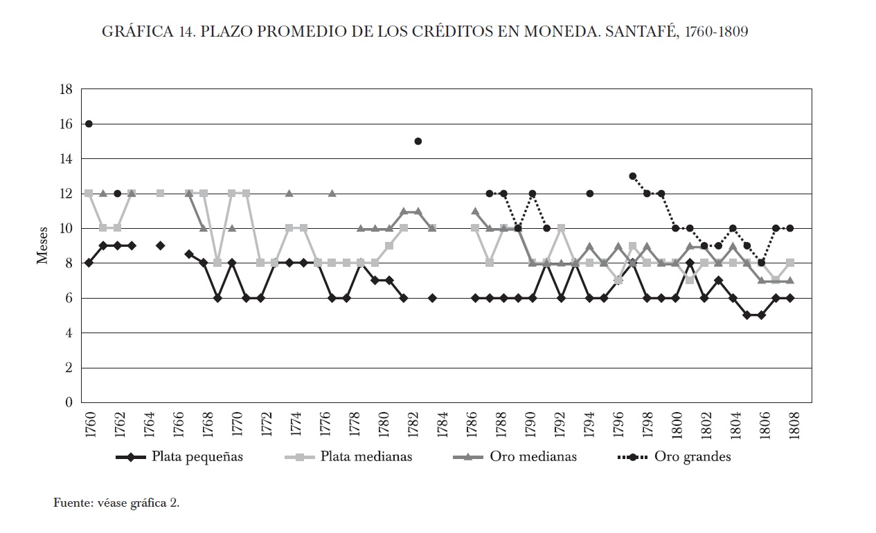 This article analyzes the credit given by merchants in Santafe de Bogota between 1760 and 1809. This required the preparation of interest rates and loans in both currency and Castilian effects, which permitted a long-term behavior analysis. It was found that the capital’s merchants made increasing amounts of loanable funds available for the colonial economy. Meanwhile, towards the end of the century, the evolution of interest rates points towards a reduction in the maximum rates, as well as a consequential relaxation of the credit supply. Furthermore it became apparent that the money market significantly reduced its transaction costs while swelling its capital turnover, thus creating an increased incentive for merchants to augment their currency loans, which in turn may have stimulated economic growth.