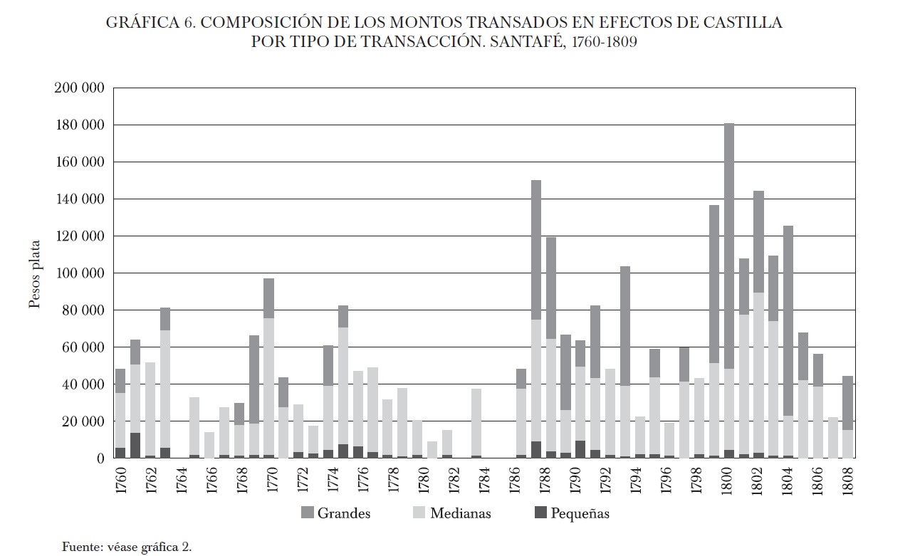 Iniciemos una vez más por el mercado de efectos de Castilla. Hemos dividido el mercado en tres tipos de transacciones: pequeñas, que comprenden el intervalo de transacciones de 0 a 999 pesos; medianas, que abarcan aquellas entre 1 000 y 9 999 pesos; grandes, que corresponden a todas aquellas mayores a 10 000 pesos. Aunque se trata de una división artificial, nos permitirá observar el comportamiento segmentado del mercado y su grado de concentración. Además, nos hemos guiado por los montos establecidos por el consulado de Cartagena para la clasificación de sus miembros (Múnera, 1998).