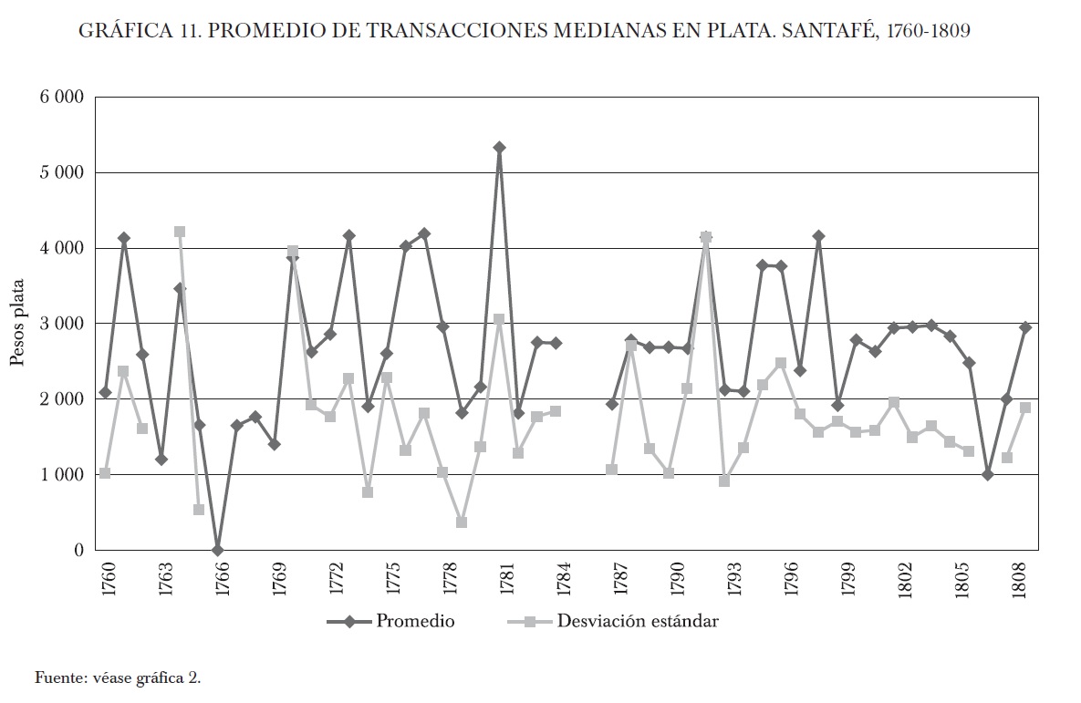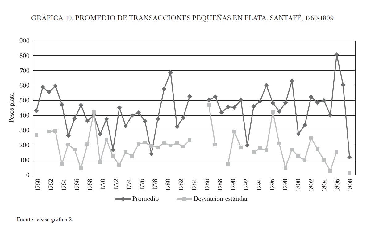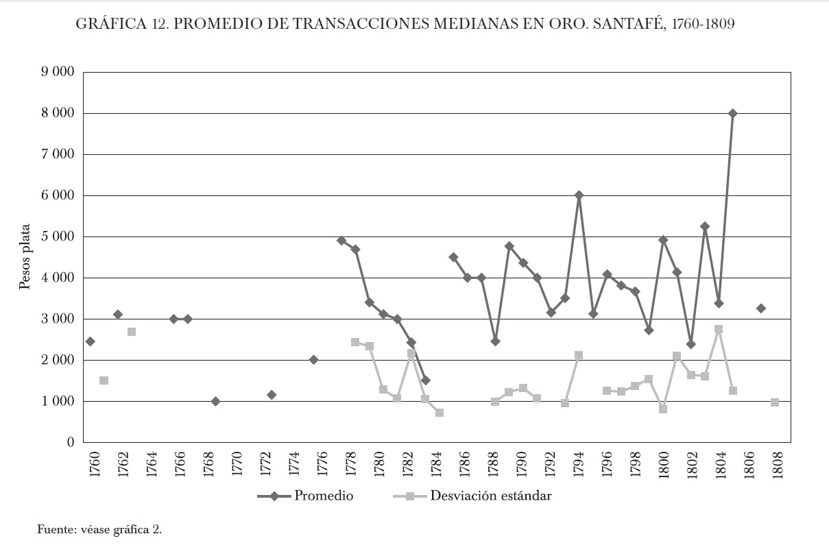 Ahora bien, ¿qué posibilitó que estas variables en el mercado metálico hayan mejorado a fines del periodo colonial? La respuesta no es fácil y sólo podemos ofrecer unas hipótesis preliminares. La primera nos conduce sin duda a las instituciones. En los últimos años existe una importante tradición historiográfica que ha hecho énfasis en las “reglas de juego” para explicar el crecimiento económico (Coatsworth y Tortella, 2007; North, 1983). En Colombia este enfoque ha sido remarcado por Salomón Kalmanovitz (2010). En el caso del sector comercial, el desarrollo de instituciones como el consulado y sus antecedentes habría disminuido el riesgo y los costos de transacción (Hausberger e Ibarra, 2003). En el caso neogranadino, es importante analizar el impacto del Tribunal de Comercio, primero, y del Consulado después (Lucena, 1986). No nos referimos al influjo de inversiones que desarrolló el consulado en donde existe un debate muy parcial sobre su fracaso o éxito (McFarlane, 1983; Múnera, 1998). En cambio, sí aludimos a la necesidad de establecer su impacto en la protección de los derechos de propiedad y la agilidad en el arbitraje de los pleitos.