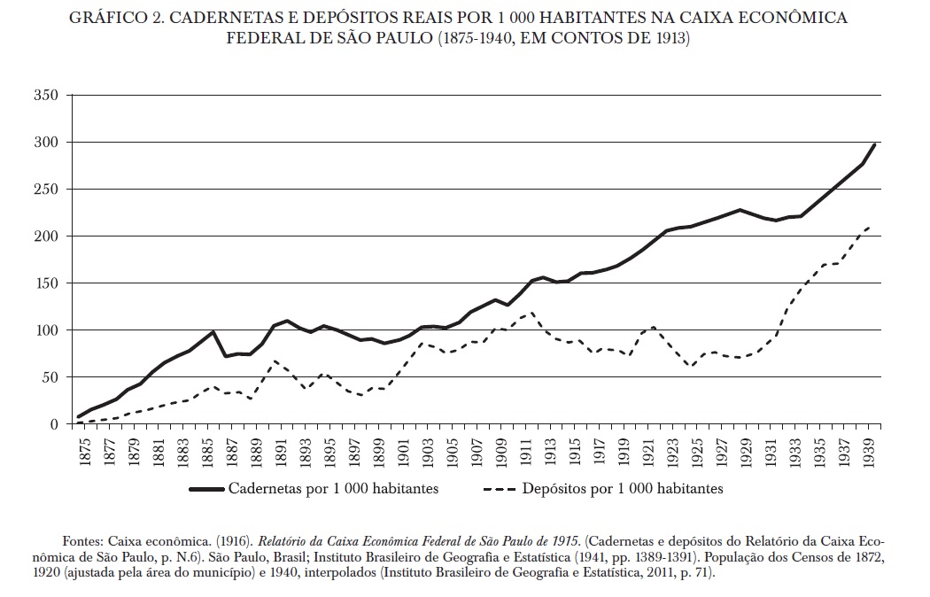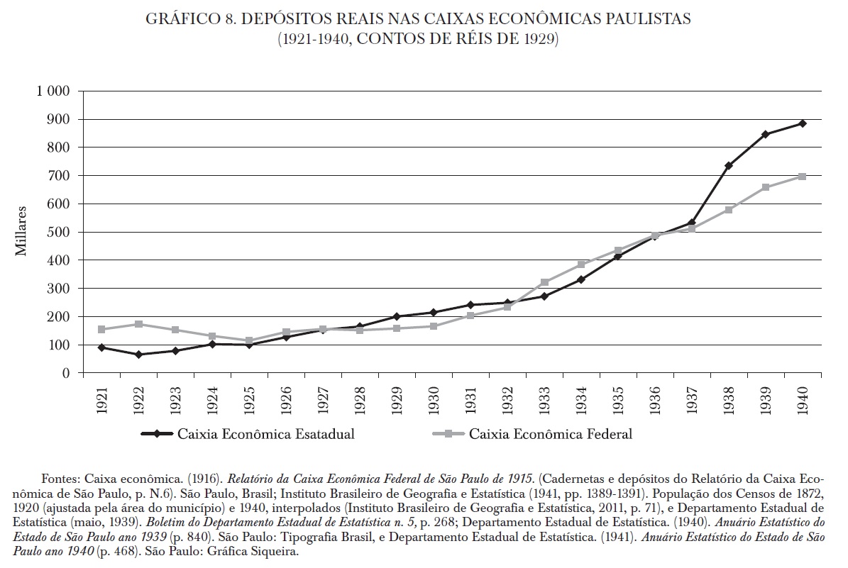 Ao acompanharmos os depósitos populares captados pelas caixas econômicas públicas verificamos sua grande difusão em relação aos habitantes das duas capitais do país, embora a população rural e das menores cidades estivessem distantes das agências destas instituições. Desde o início das operações das caixas, o número de cadernetas e os depósitos reais cresceram a taxas superiores à da população, salientando a presença até de escravos, além de menores e principalmente mulheres. Quando analisamos relativamente às demais instituições bancárias, verificamos a elevada importância das caixas. Apesar da grande expansão do Banco do Brasil após a primeira grande guerra, as caixas mantiveram depósitos de pelo menos a metade do total do banco, crescendo nos anos 1930. Se compararmos com o movimento bancário e mesmo o PIB, verificamos uma menor participação nos anos 1920, refletindo a dificuldade relativa de captação das caixas nesse período. Contudo, elas apresentaram um forte crescimento relativo aos bancos e PIB nos anos 1930, salientando a demanda por depósitos em instituições públicas durante a grande crise dessa época. Por fim, a Caixa Estadual Paulista cresceu rapidamente após a primeira grande guerra, captando depósitos de forma ampla pelo estado, mesmo nos anos 1920. Nos anos 1930, as caixas diversificaram a sua atuação, realizando empréstimos de diferentes tipos, especialmente imobiliários urbanos. Mesmo após a reorganização elas continuaram como um importante instrumento de captação de depósitos populares, como na origem da instituição em 1861.