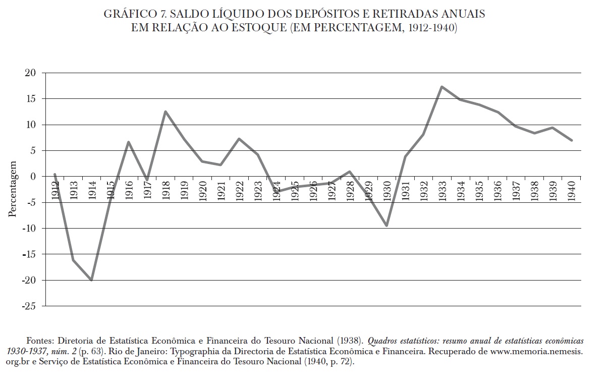 A conjuntura econômica e financeira marcou os novos depósitos e as retiradas das caixas, como o encilhamento e a crise bancária na passagem para o século XX. No período de 1912 a 1940, os movimentos líquidos de saques ocorreram antes e início da primeira grande guerra (1913 e 1914), meado da década de 1920 e no início da crise de 1929, como pode ser observado no gráfico 7 abaixo. No primeiro subperíodo, a perspectiva e depois a eclosão da primeira grande guerra produziu retiradas em grande proporção. No outro momento, os saques não se mostraram tão expressivos em relação aos depósitos totais, mas ocorreram em vários anos seguidos. O fortalecimento da concorrência bancária e as dificuldades das caixas expandirem-se nessa época ajudam a explicar a retração. Por fim, a grande crise de 1929 deve explicar um movimento de saques maiores do que depósitos, mas não tão graves quanto ao do início da primeira grande guerra.