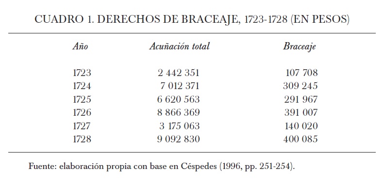 La suma por concepto de braceaje fue entonces de 4.41% del total nominal acuñado (véase cuadro 1).