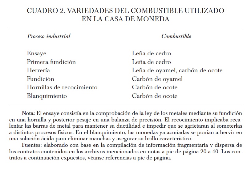 La Real Casa de Moneda tenía numerosos hornos que requerían abasto suficiente y continuo de combustible. No era todo de la misma condición, porque el tipo dependía de la viveza del fuego requerido, o de la conveniencia de tener una fuente de calor duradera y graduable (véase cuadro 2).