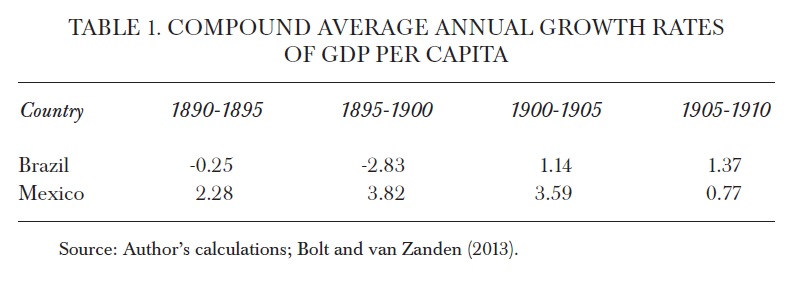 Table 1 shows estimates of the annual average rates of growth of per capita GDP, measured at purchasing power parity over five-year intervals. The data are from the Maddison dataset (Bolt and van Zanden, 2013). Mexico outperforms Brazil in every 5-year period except the last one, by which time Brazil had adopted a restrictive banking system that was similar to Mexico’s. In addition, Mexico felt some contagion from the US-based Panic of 1907, Brazil to a lesser degree. Brazil’s per capita income growth is negative in nine of the ten years from 1890 to 1900. In 1890 it had per capita income equal to 78.5% of Mexico’s, but by 1900 the ratio had fallen to 49.7%. In total, Brazil had negative per capita growth in eleven of the fifteen years between 1890 and 1905.