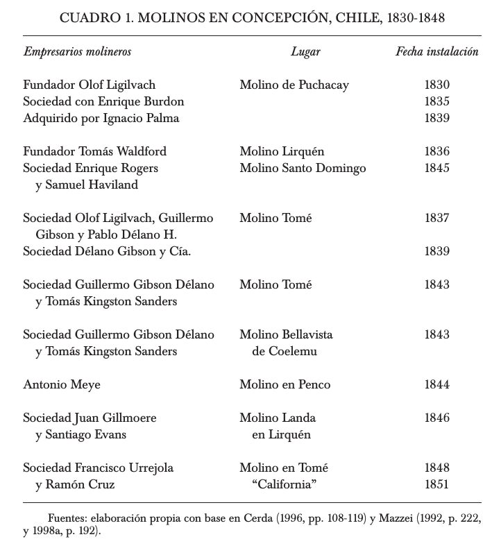 El dinamismo observado en la frontera del Biobío por la expansión triguera se conectaba con la nueva demanda de insumos de la industria molinera, instalada en la región en las décadas de 1830 y 1840 (véase cuadro 1). El despegue de la molinería fue facilitado por el acceso a una abundante producción triguera regional aportada por campesinos e indígenas de la provincia y la zona fronteriza. Situación que permitía a los molineros obtener cada fanega13 de trigo puesta en las bodegas de Tomé a un costo de doce reales (Mazzei, 1998a, p. 198).