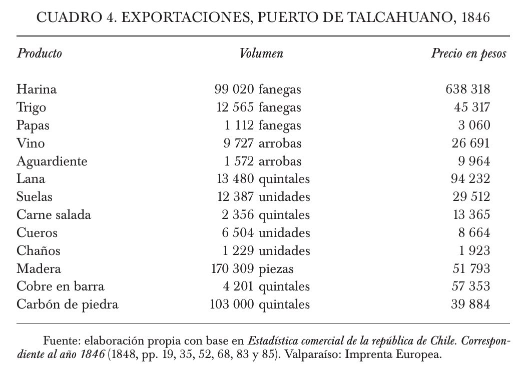 En términos de volumen físico y valor del comercio exterior en el puerto de Talcahuano en 1846, la producción molinera de harina representó cerca de 50% de las exportaciones. También es significativo el rubro de vino y aguardiente asociado a una importante actividad vitivinícola regional. Las remesas agrícolas conformaban el principal rubro del cabotaje con la zona minera de los puertos de Coquimbo, Huasco y Copiapó, donde se enviaban alimentos por un costo de 197 640 pesos, constituyéndose uno de los principales focos del comercio agrícola regional de Concepción (Mazzei, 1998b, pp. 154-155; Pinto y Ortega, 1991) (véase cuadro 4).