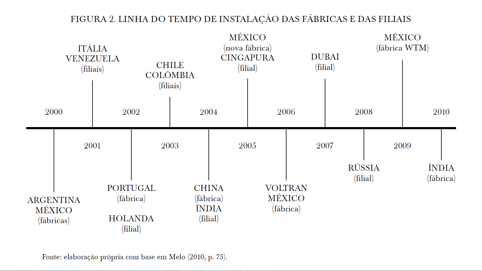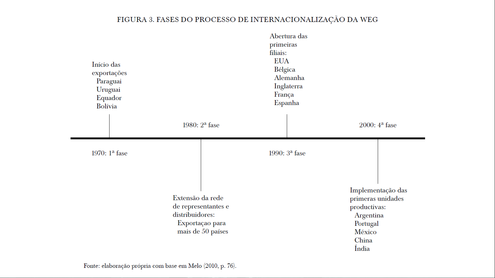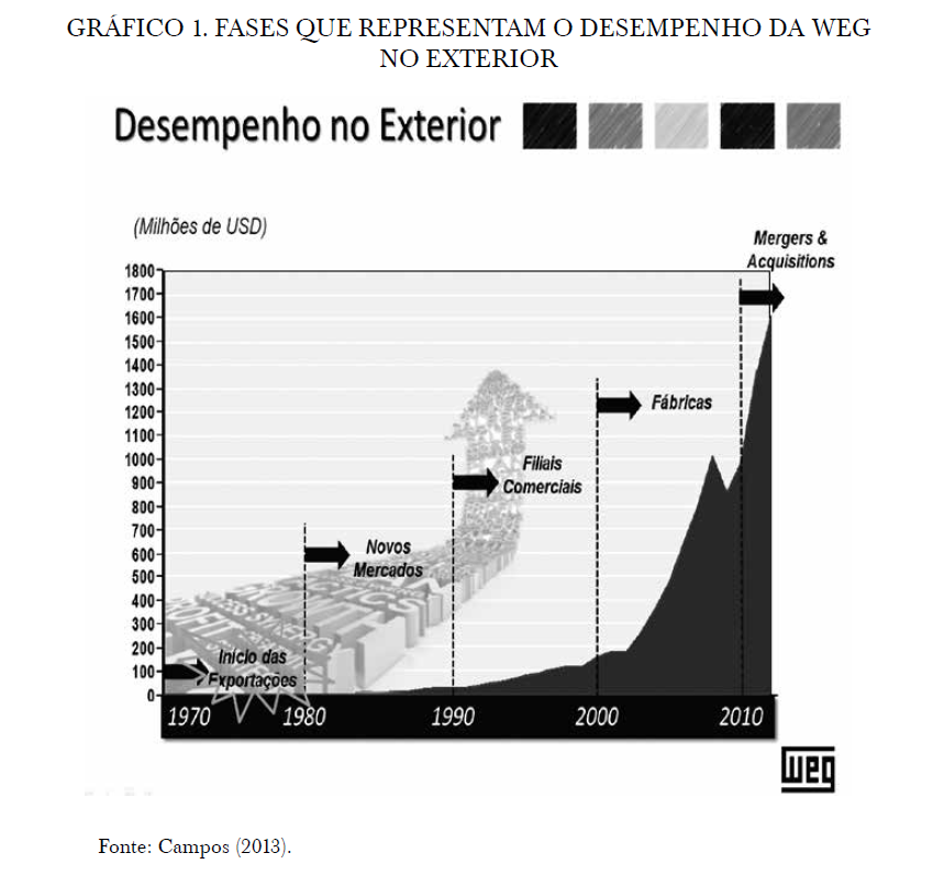 O gráfico 1 possibilita visualizar como se deu o processo de internacionalização da Weg a partir das diferentes fases vividas, desde o início das exportações, da busca de novos mercados, da implantação de filiais comerciais e, por fim, da construção e aquisição de fábricas.