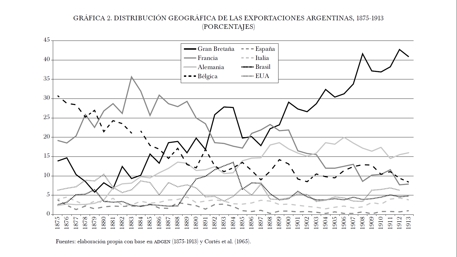 Los socios comerciales incluidos han sido Reino Unido, Estados Unidos, Francia, Alemania, Brasil, Italia, España y Bélgica. Esta muestra de países coincide en su mayor parte con la utilizada en el trabajo de Tena y Willebald (2013) con alguna excepción. En este caso hemos incluido también a Brasil, que fluctúa entre 2 y 13.5% de la exportación argentina, según nuestra serie. Por otro lado, Tena y Willebald incluyen los Países Bajos sólo para el periodo de 1905 a 1913. En este caso no hemos incluido a este país debido a la reconocida problemática de reexportación en las estadísticas holandesas.