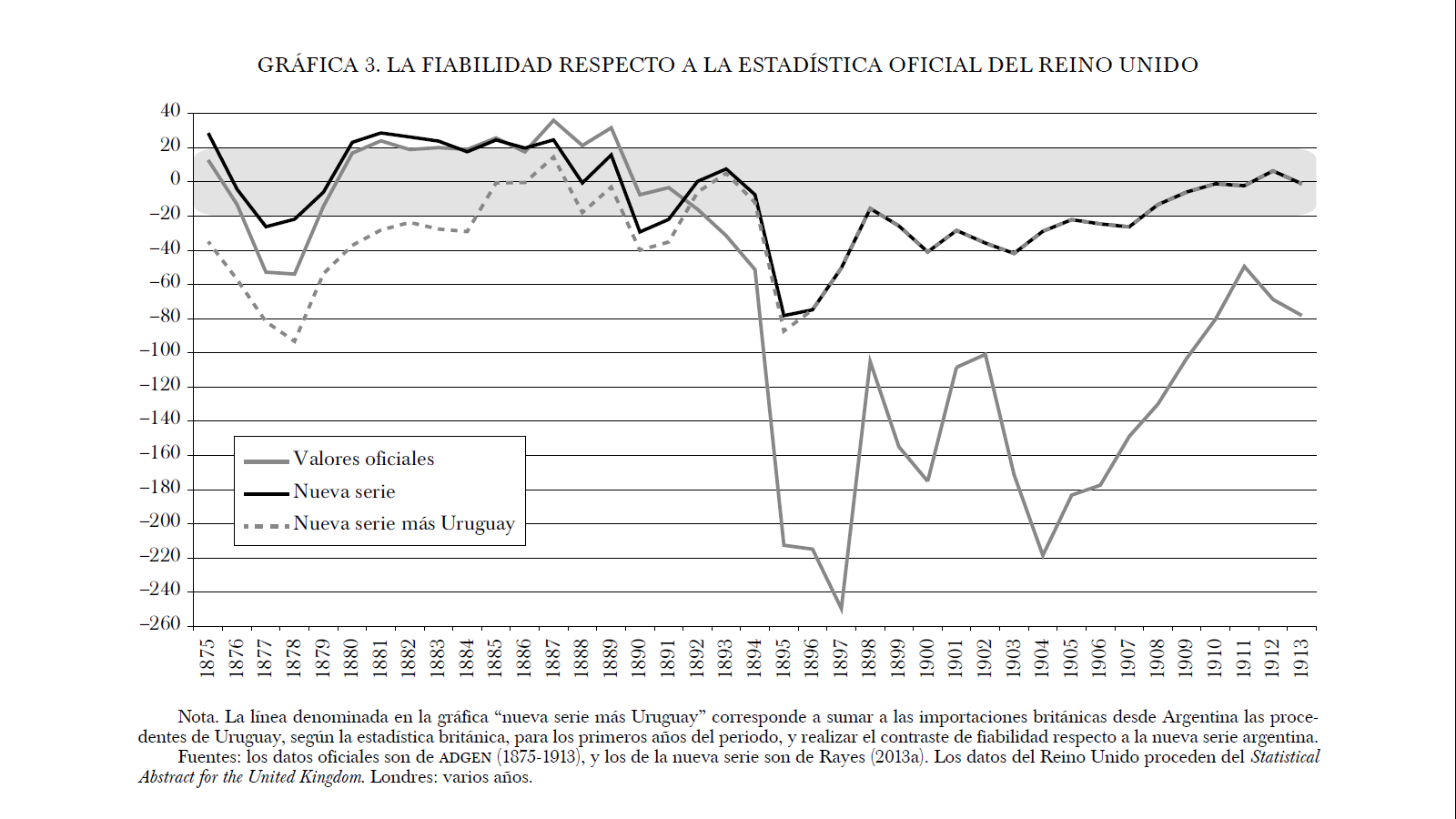 La banda sombreada en gris indica los márgenes de 20% en los que las discrepancias entre series podrían justificarse a través de los fletes u otros costes. En los primeros años del periodo se observa un signo inesperado que indica una sobrevaloración argentina o una infravaloración británica. En este último caso, podría tratarse de un problema de asignación geográfica relacionado con el puerto de Montevideo, es decir, la estadística inglesa pudo asignar como uruguaya mercadería que era argentina durante la década de 1880. Platt (1971) subraya la importancia de los problemas asignativos en las estadísticas británicas anteriores a 1900: "Before the improvement of the port of Buenos Aires, late in the nineteenth century, a substantial proportion of Argentine imports was transhipped from ocean steamers at Montevideo, but the new docks reversed the flow, so that Uruguayan imports might now arrive through Buenos Aires" (pp. 119-120). Para poder verificar este punto hemos añadido los datos de las exportaciones uruguayas a la estadística británica en los primeros años del periodo 1875-1893. Ello mejora sustancialmente el problema de la sobrevaloración, lo que indica que una parte importante de esta discrepancia podría, efectivamente, ser atribuida al error asignativo en la estadística británica. Este resultado reafirma el obtenido por Carreras-Marín y Badía-Miró (2008), según el cual las estadísticas latinoamericanas tendrían niveles razonables de fiabilidad en cuanto a la distribución geográfica de su comercio, mientras que las estadísticas europeas adolecerían de sistemáticos sesgos en la asignación geográfica tendentes a sobredimensionar los principales puertos de las rutas transoceánicas.