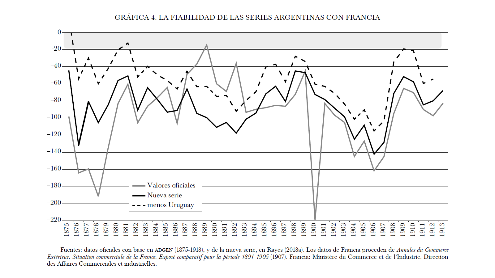 De forma similar a lo que hemos constatado en el caso británico, el problema también puede existir en que la estadística francesa considerara como procedentes de Argentina artículos uruguayos o brasileños; de hecho, tal y como se refleja en otro trabajo (Rayes, 2013a), la estadística francesa incluía como procedentes del "Río de La Plata" distintas partidas de cueros y lanas. Para el caso del comercio bilateral entre Argentina y Francia, el uso de las fuentes oficiales o el de la nueva serie argentina no alcanzan los niveles mínimos de fiabilidad estadística, situándose demasiado por debajo de los límites máximos razonablemente previstos. No obstante, no por ello debiera descartarse, porque el problema puede residir, como señalamos, en el registro estadístico francés.