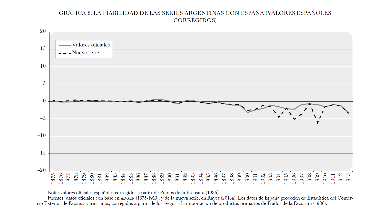Hay que considerar que los porcentajes de las discrepancias estadísticas entre España y Argentina se refieren a valores menores en términos relativos, así que aunque estos sean elevados, los montos totales distan considerablemente de los valores del comercio británico, francés, belga o alemán (véase gráfica 7). En la última década del periodo se observa una agravación de las discrepancias que afecta tanto a la nueva serie como a la oficial. Si lo dejáramos así el resultado sería claramente negativo para la estadística argentina, con o sin correcciones. No obstante, cabe destacar que las series oficiales españolas han sido objeto de serias críticas y, por ello, se han reestimado a partir de la información de los principales socios comerciales (Prados de la Escosura, 1986).