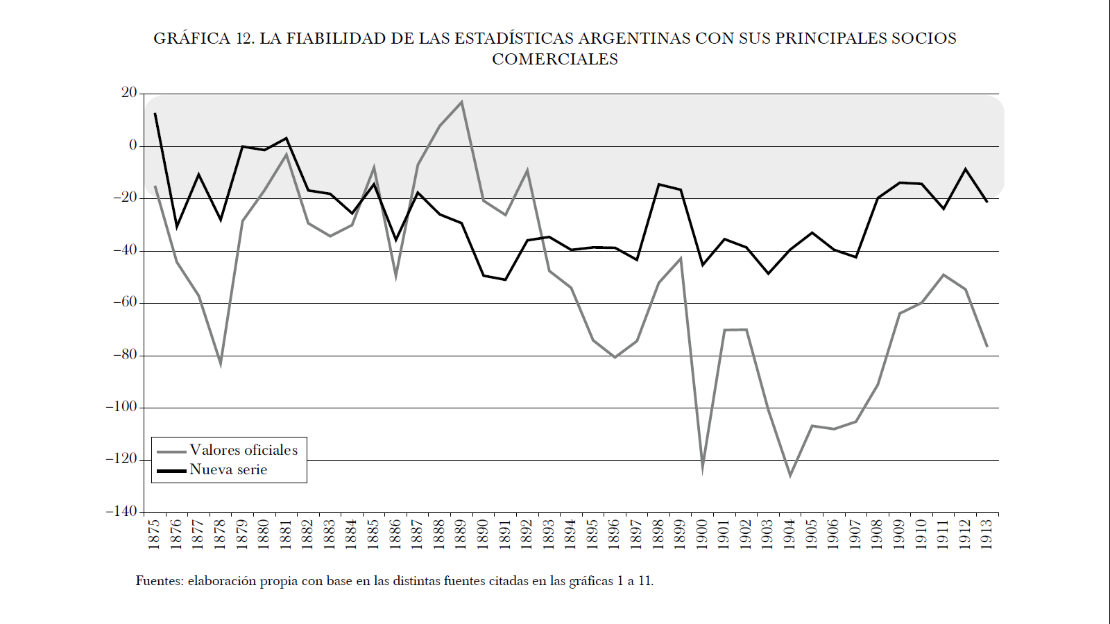 Para el caso de Brasil, sólo se dispone de datos en el periodo 1901-1913 (véase gráfica 10). Las distancias entre la serie oficial y la nueva no son demasiado relevantes y ambas se mantienen en bandas más que razonablemente aceptables, por debajo de 20% en la mayor parte del periodo. La proximidad geográfica y la ausencia del comercio "a órdenes" probablemente sea la explicación de la menor incidencia de los errores asignativos entre sus estadísticas. El resultado razonablemente fiable de los datos de comercio con Brasil refuerza la hipótesis de que frecuentemente los problemas de fiabilidad se derivan de errores de asignación geográfica con los socios comerciales geográficamente más distantes.