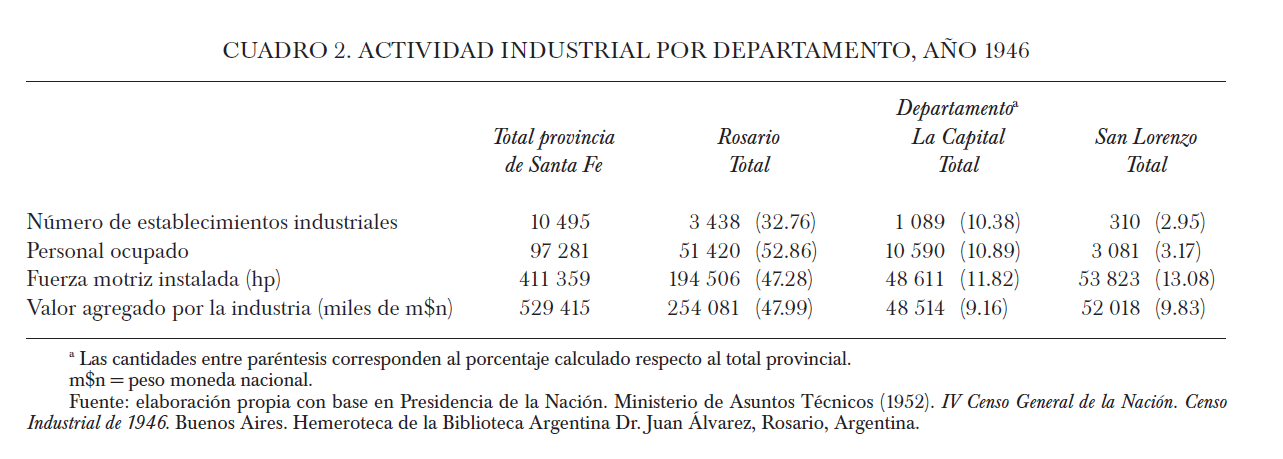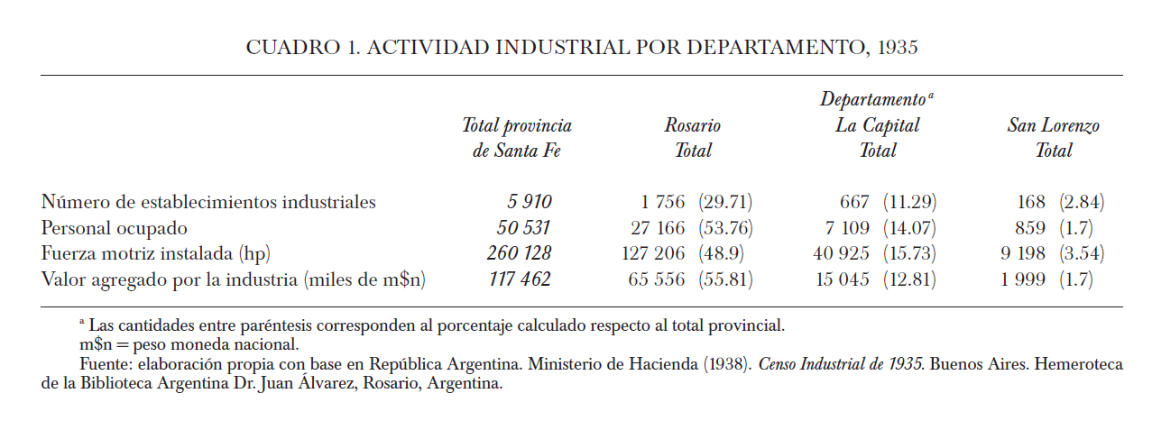 En el año 1935 el sureño departamento Rosario concentraba casi 30% del total de establecimientos industriales de la provincia, cerca de 54% del personal ocupado, de 49% de la fuerza motriz instalada y de 56% del valor agregado por la industria, notablemente por delante del departamento donde está situada la capital provincial, y del colindante San Lorenzo, que dos décadas más tarde será epicentro de una nueva etapa de industrialización en la región (véase cuadro 1).