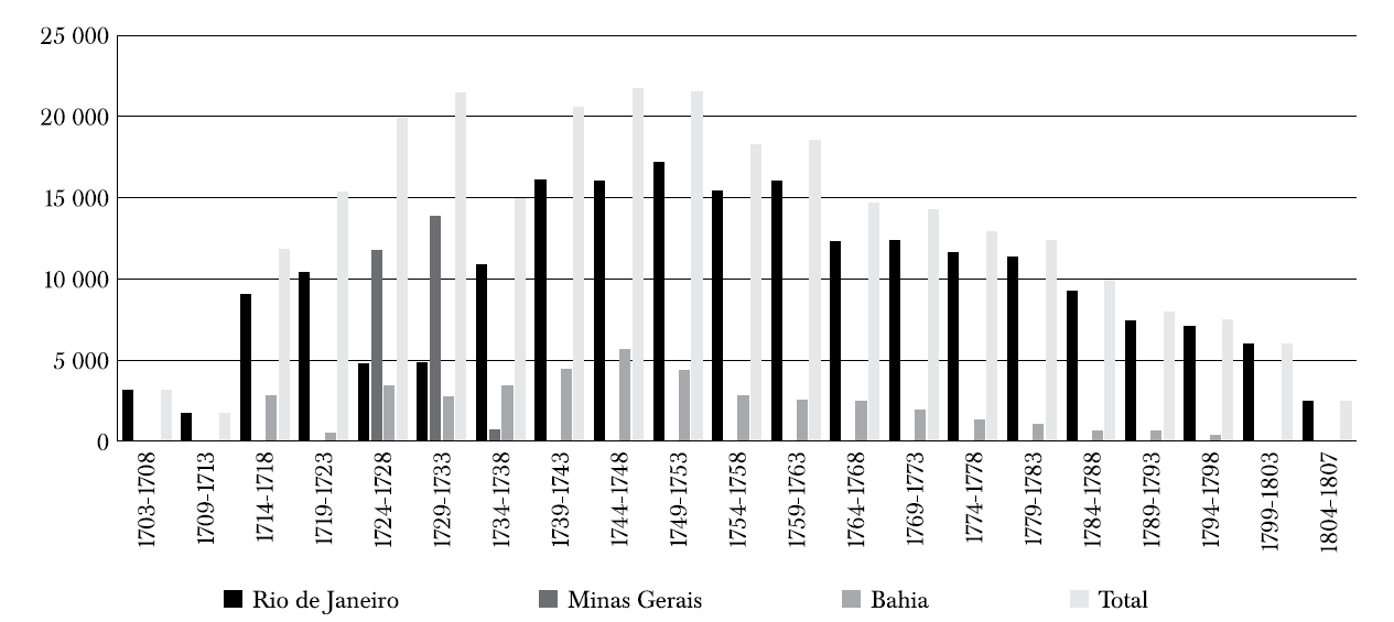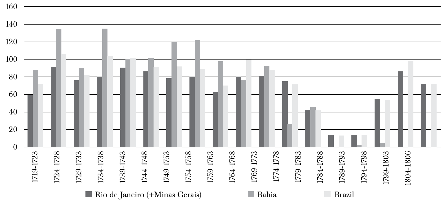 Sources: Rio de Janeiro, periods 1703-1767 and 1797-1807, Soetbeer (1880), for the period 1768-1796, “Meio circulante”, 1883. For Minas Gerais, Boxer (1962). For Bahia, AHU_CU_Bahia_CA, doc. 19715.