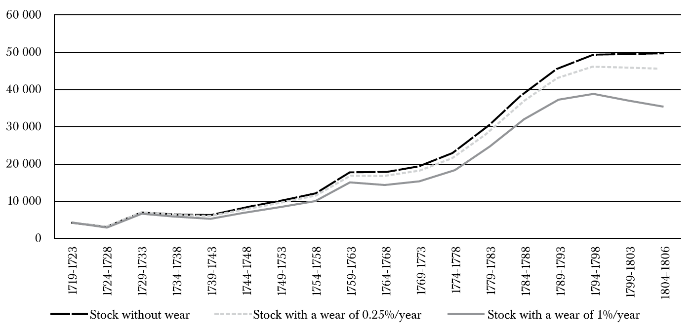 One question remains, what is the initial value to be taken into account? The most exact calculation is only possible from 1719 onward, as the value of the remittances sent on the fleets only started to be recorded as from 1720 (Costa, Rocha & Sousa, 2013). However, there are some data available about the gold imported to Lisbon as from 1713, before the beginning of a fleet system in 1720 (Lopes, 2001). According to these data, the value of gold arriving in Lisbon between 1713 and 1719 amounted to 2 627 contos. However, this amount corresponds to gold bullion, as there is almost no record of coins entering the country; in other words, roughly 16 700 contos worth of gold minted as national gold coins at the Rio de Janeiro and Bahia mints (see table 2, appendix) are not included in the data before 1720. In this sense, while this might represent a possible methodology for calculating the value of 1719, its calculation is not reliable, for the reasons that have been explained above. We, therefore, assume a base value of zero in 1719, as it is not possible to precisely assess the amounts that remained in Brazilian territory.