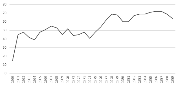 El indicador se mantiene entre 20 y 30% en los años sesenta, crece netamente entre 1973 y 1975, y luego conserva una tendencia creciente hasta 1989. El incremento del precio del azúcar en el mercado libre en 1973, que se multiplica por tres en un solo año, y el cambio metodológico en 1977 (Mesa-Lago y Pérez, 1985, p. 11), con el cual se reducen los dobles conteos en el PSG, son dos factores exógenos que contribuyen a causar el fuerte aumento entre 1972 y 1975. Sin embargo se pueden apreciar dos etapas: en la primera (hasta 1972) el índice se mantiene bajo y estable; en la segunda, se multiplica por dos, y muestra una tendencia creciente. Esto se explica con el proceso de integración en el CAME que comenzó precisamente en 1972, la autocrítica del gobierno cubano sobre la etapa “idealista” de los años sesenta, y la alineación al bloque socialista guiado por la Unión Soviética del cual Cuba había tratado de prescindir en la primera década.