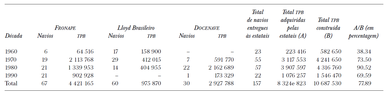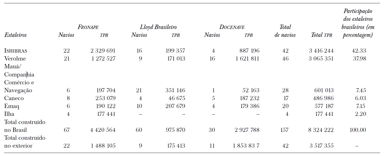 Houve uma divisão de encomendas dentro dos planos da construção naval entre os armadores estatais: a FRONAPE optou pelo ISHIBRAS e Verolme; o Lloyd Brasileiro, pelo ISHIBRAS e Mauá; e a Docemave pelo Verolme. Na década foram recebidas sete novas embarcações construídas no Brasil: quatro bulk carrier e três ore-oil tanker, que somaram 591 770 TPB (ver anexo 1). As aquisições eram todas financiadas com recursos do Fundo da Marinha Mercante, que era controlado por SUNAMAM e Banco Nacional de Desenvolvimento Econômico e Social.