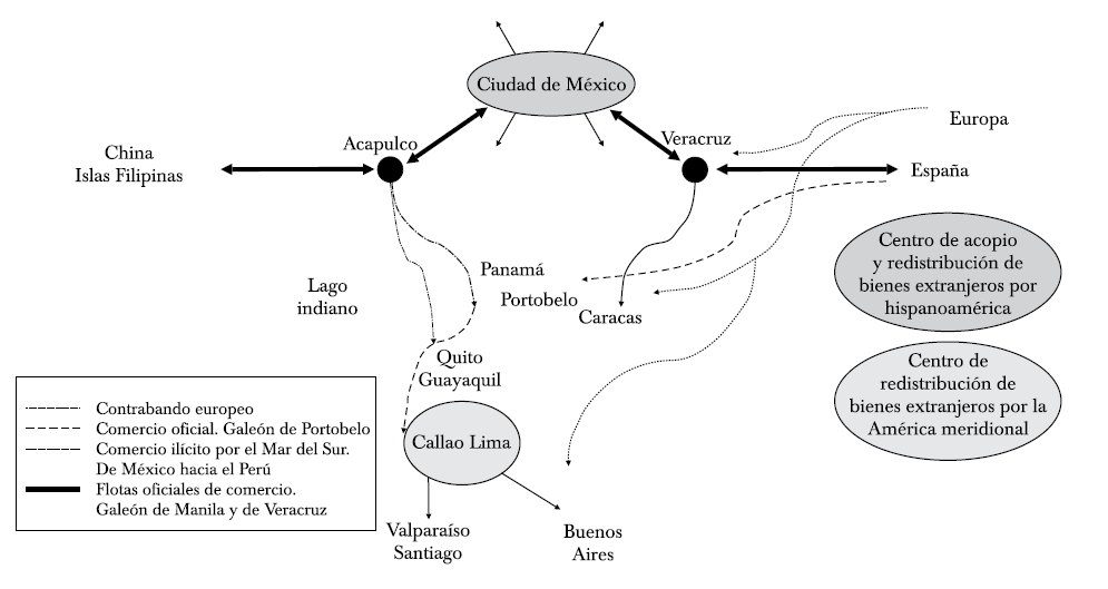 Ahora bien, el funcionamiento y dinámica del comercio por el lago indiano fue una de las piezas clave para la constitución de un tejido comercial a escala imperial y global, que ubicó a la ciudad de México como su "corazón". Esta se convirtió en el principal punto de acopio y redistribución de mercaderías extranjeras por todo el espacio hispanoamericano. El tejido funcionó con suma intensidad en dos periodos concretos: 1580-1640 y 1680-1740 (Bonialian, 2014, pp. 27-82). Dos de los tres circuitos que conformaron las "columnas" del tejido se desarrollaron por el lago indiano: el eje transpacífico del Galeón de Manila y los contactos ilícitos entre México y Perú por el Mar del Sur. El tercer circuito se ubicó por el lado Atlántico, motorizado por la flota de Veracruz. La flota española, medio de unión entre el puerto de Cádiz con el de Veracruz, y el eje transpacífico, que enlazaba a las islas Filipinas con el puerto de Acapulco a través del Galeón de Manila, permitió que la ciudad de México se transformase en el principal depósito y reexpedición de mercaderías extranjeras por Hispanoamérica (véase diagrama 1).